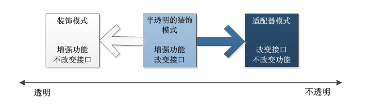 显然,半透明的装饰模式实际上就是处于适配器模式与装饰模式之间的灰色地带。如果将装饰模式与适配器模式合并成为一个“包装模式”的话,那么半透明的装饰模式倒可以成为这种合并后的“包装模式”的代表。