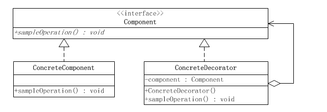 如果只有一个ConcreteComponent类,那么可以考虑去掉抽象的Component类(接口),把Decorator作为一个ConcreteComponent子类。如下图所示: