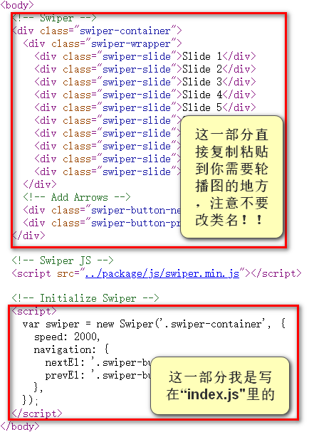 找到<!--swiper-->下面的就直接复制粘贴到相应的需要轮播图的html文件位置,注意类名不要更改!!!里面的内容可以相应地改为你需要的图片