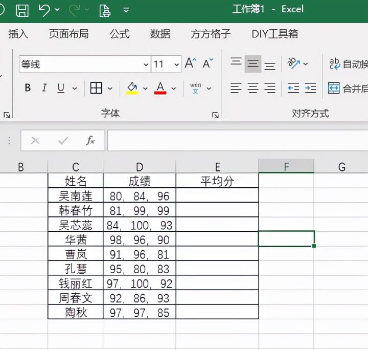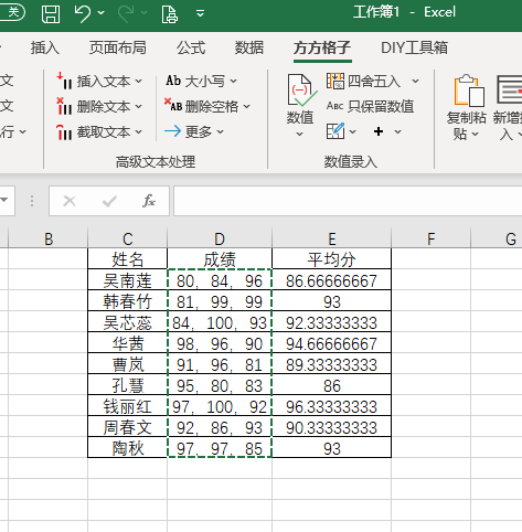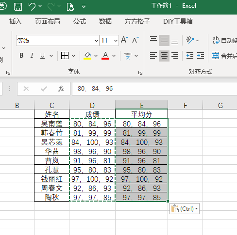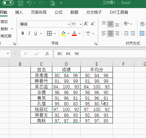 2.将成绩列数据复制一份到平均分列,并选中平均分列单元格数据