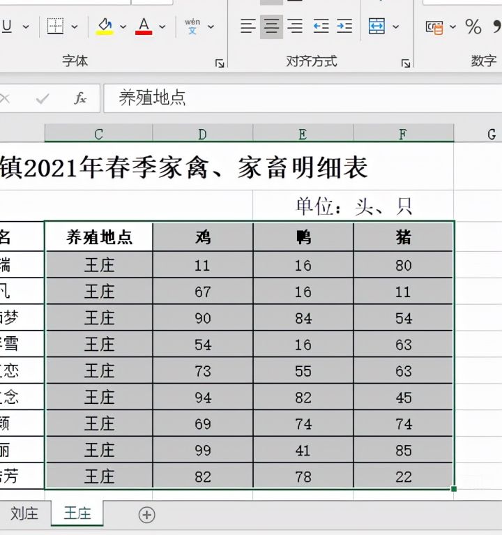 1.打开演示文件,要求快速计算各个养殖地点各个家禽的养殖总和。