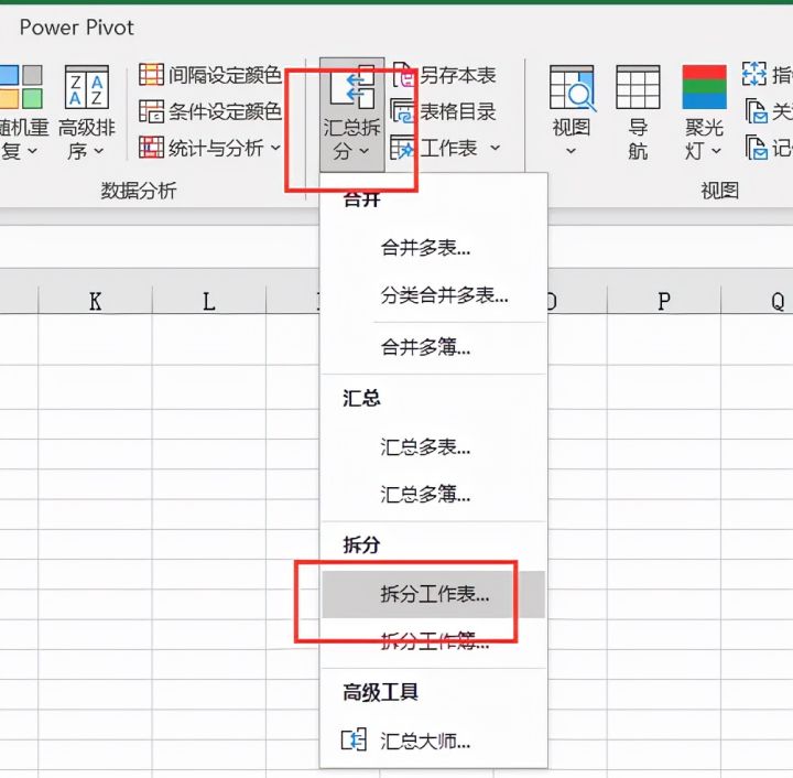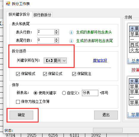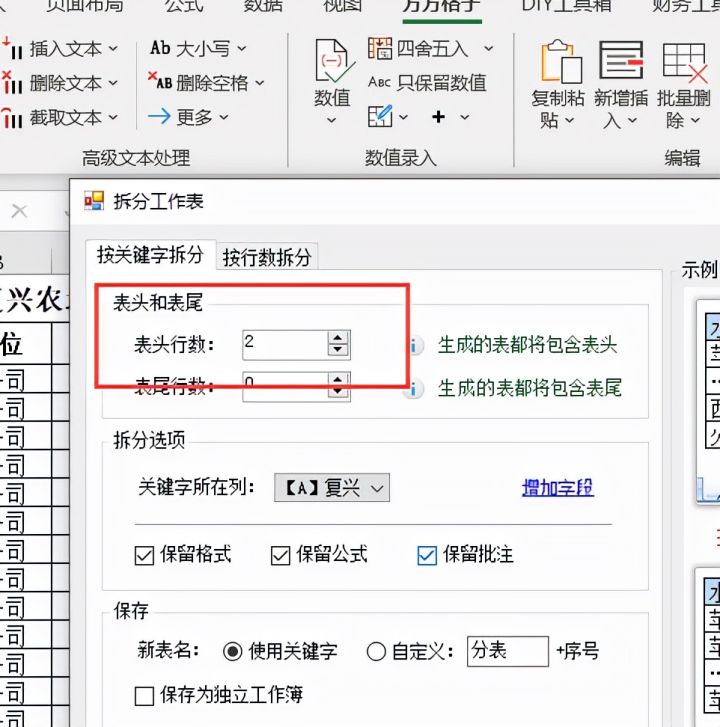 4.点击【按关键字拆分】,然后将表头行数设置为2