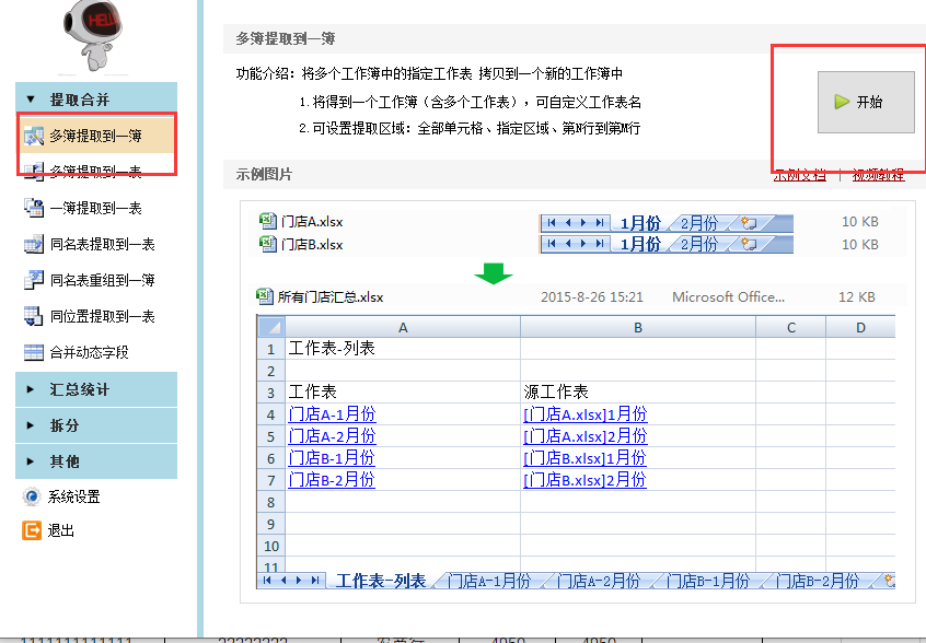 4.然后我们点击【多簿提取到一簿】,点击【开始】