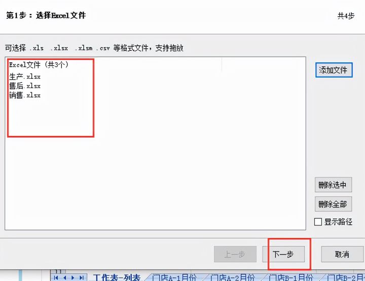 5.然后将要处理的表格拖动到下图区域,点击【下一步】