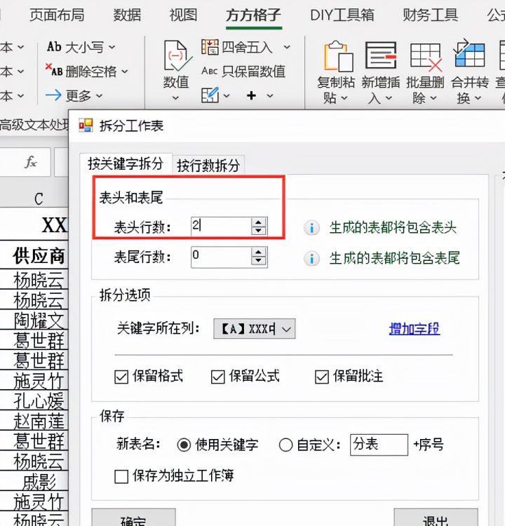 4.接着在表头行数选项中录入2