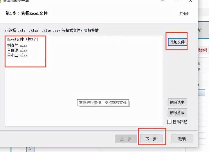 5.点击【添加】将这三个工作簿添加进来,接着点击【下一步】、【下一步】、下一步
