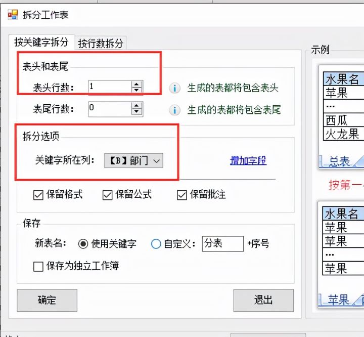 4.接着我们将表头行数设置为1,将关键词所在列设置为B