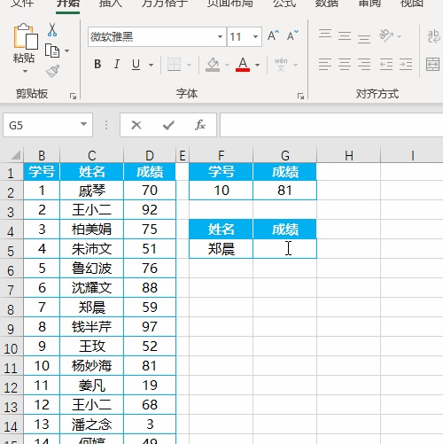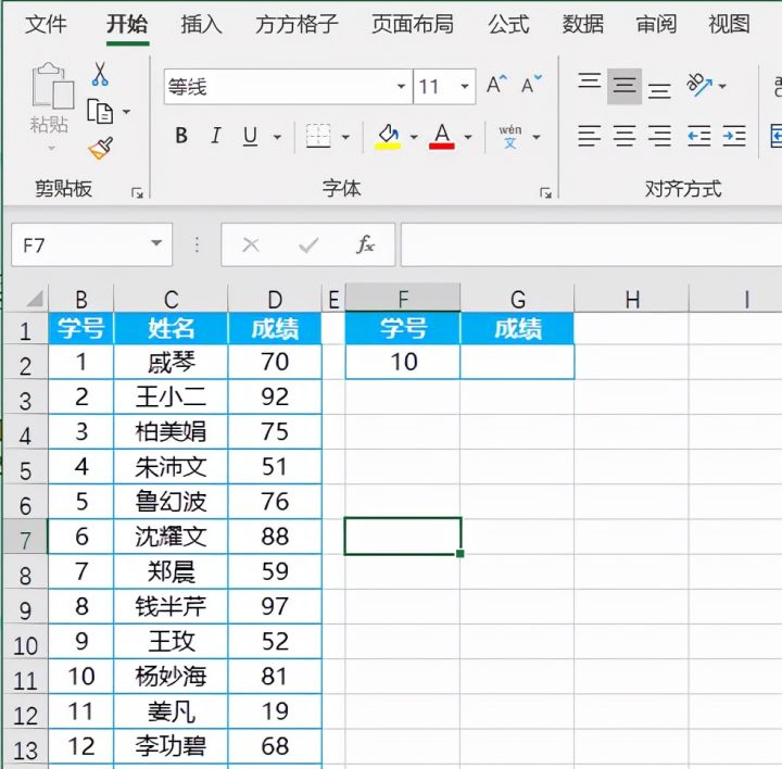 4、如下图所示,是某班级学生成绩表,班级中学生人数人多。现在我们想用vlookup函数快速的查找出学号为10的学生成绩。
