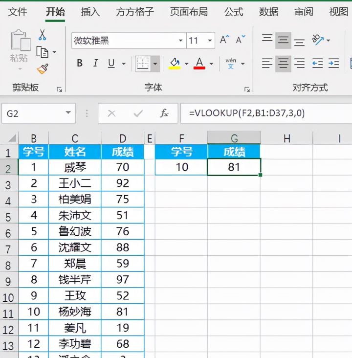5.根据我们之前说的语法VLOOKUP(查找值,查找区域,返回查找区域第N列,查找模式),我们在G2单元格输入公式=VLOOKUP(F2,B1:D37,3,0),就可以快速查找出学号为10的学生成绩