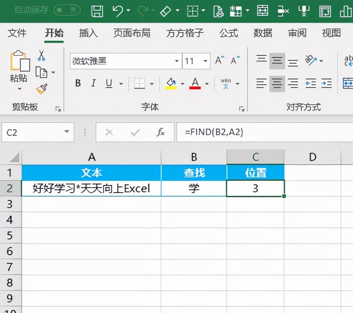 3、在单元格输入公式=FIND(B2,A2),即可以查找到学字的位置
