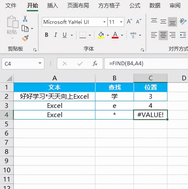 如下图,查找通配符“*”的位置。输入公式=FIND(B4,A4),结果返回为错误值。