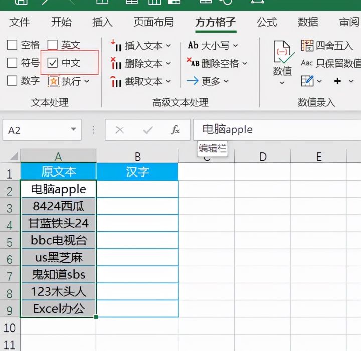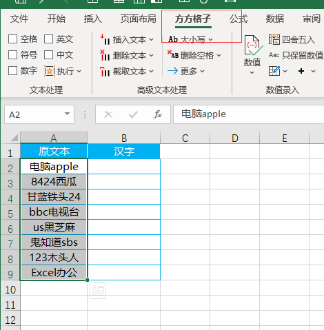 3.点击方方格子(一款Excel插件,下载安装方法百度即可)
