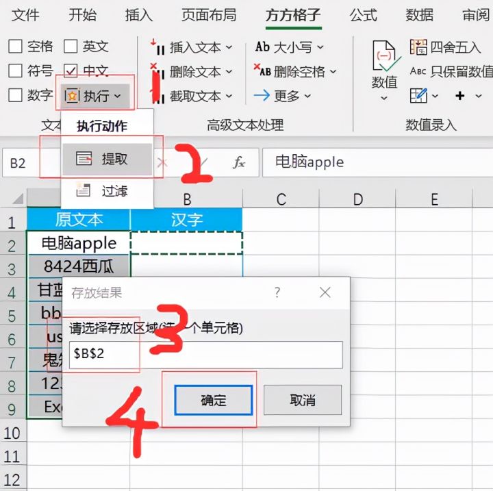 5.点击执行,选择提取,在弹出菜单中选择汉字存放区域,最后点击确定即可