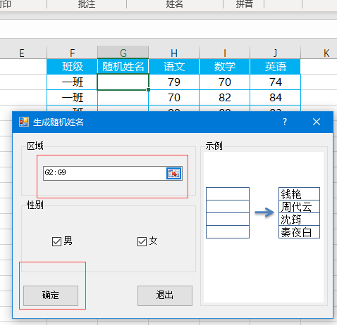 4.在弹出对话框,区域选项中,输入G2:G9(既要添加姓名的单元格区域),然后点击确定,即可生成姓名。