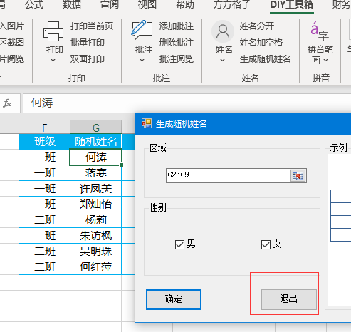 5.如果不满意生成的姓名,可以点击确定生成一份新的姓名,满意的话点击退出即可