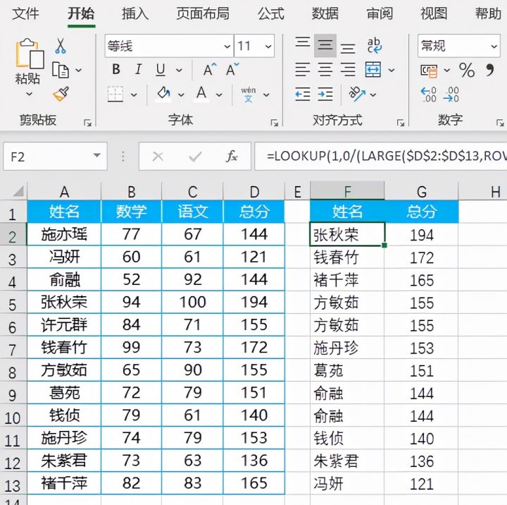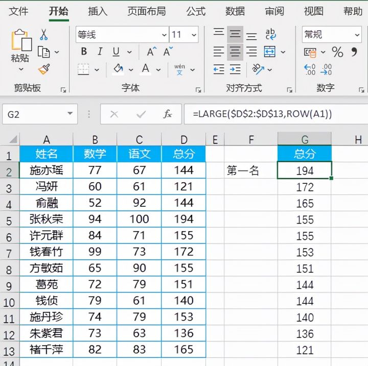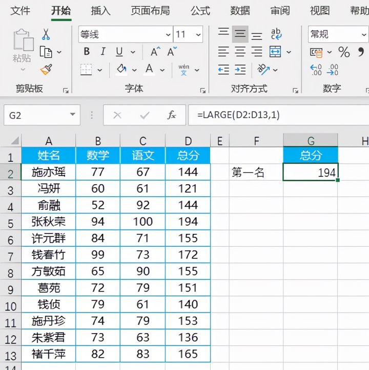 如下图查询总分最高分数是多少,在G2单元格输入公式=LARGE(D2:D13,1) 即可查询到最高分