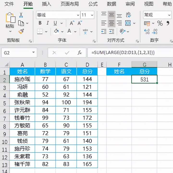 如下图,在公式中输入=SUM(LARGE(D2:D13,{1,2,3})) 即可算出前三名总分之和