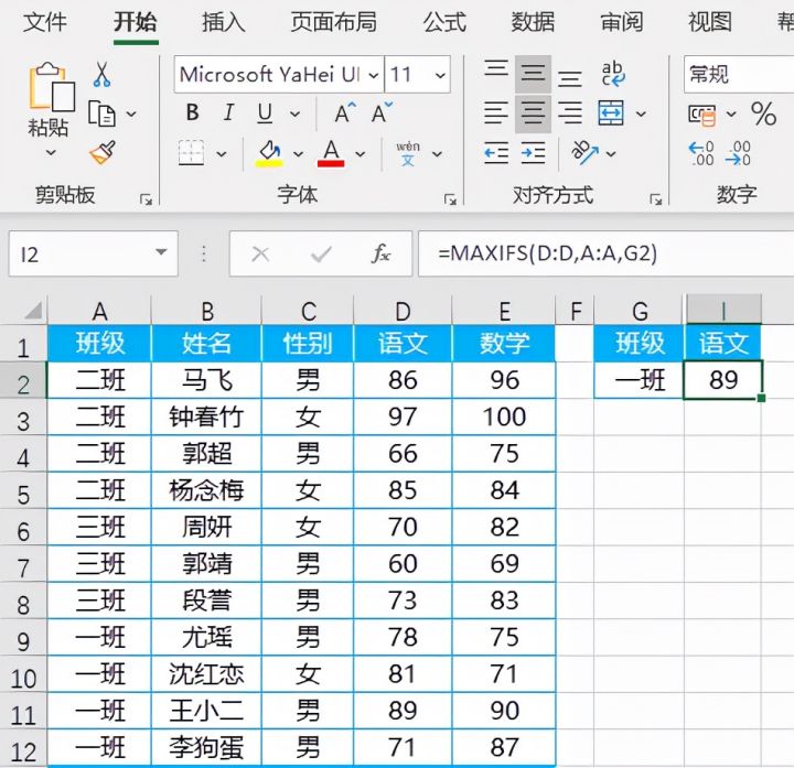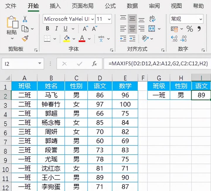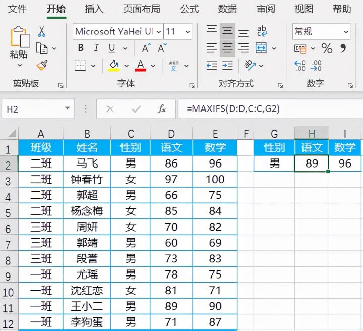 如下图,在H2单元格输入公式=MAXIFS(D:D,C:C,G2)即可查询出男生语文最高分为89,在I2单元格输入=MAXIFS(E:E,C:C,G2)即可查出男生数学最高分为96