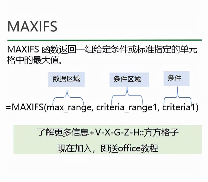 函数MAXIFS是返回一组给定条件的单元格的最大值,它的语法结构是=MAXIFS(max_range,criteria_range,criteria,...)