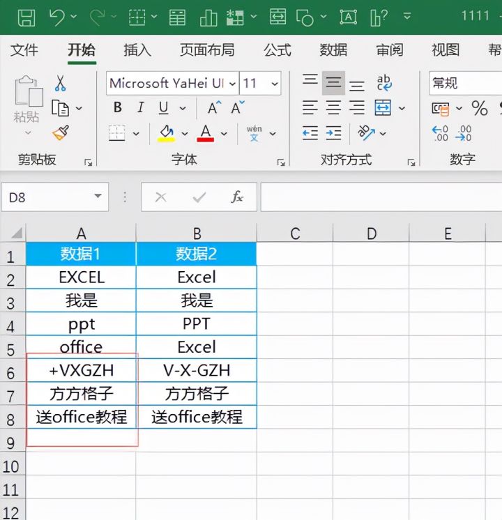 如下图,单元格中有两列数据,现在我们想要对比这两列数据是否完全一致。