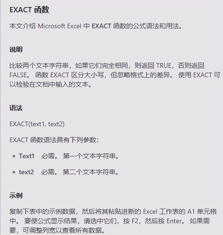 相信很多朋友不了解exact函数,下面就跟大家介绍一下。EXACT函数用于比较两个字符串,如果它们完全相同,则返回TRUE,否则返回FALSE。它的语法结构是EXACT(text1, text2)