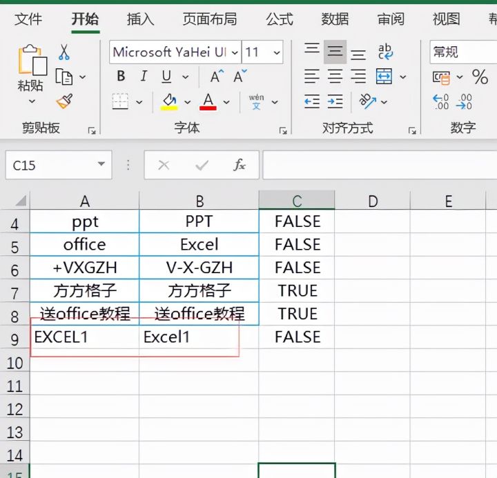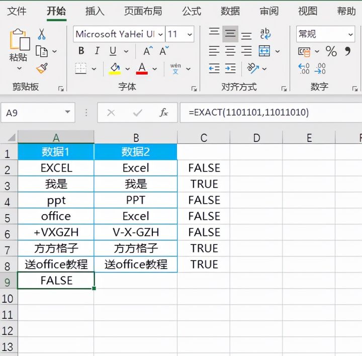 同样需要注意的是exact函数是区分大写小写的,如下图,对比A9内容为EXCEL1而B9单元格内容为Excel1,使用exact函数对比A9和B9,返回结果为false