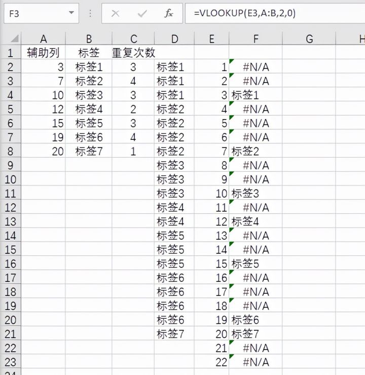 在本文中vlookup函数的作用是在区域A:B中查找row函数返回的结果并返回对应的标签列数据。如果可以查找到则返回对应的标签值,如果查找不到则返回错误值。为方便大家理解在单元格中输入公式=VLOOKUP(E2,A:B,2,0),结果如下图所示