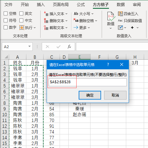 在弹出对话框中输入A2:B28即姓名和月份列全部数据区域,然后点击确定