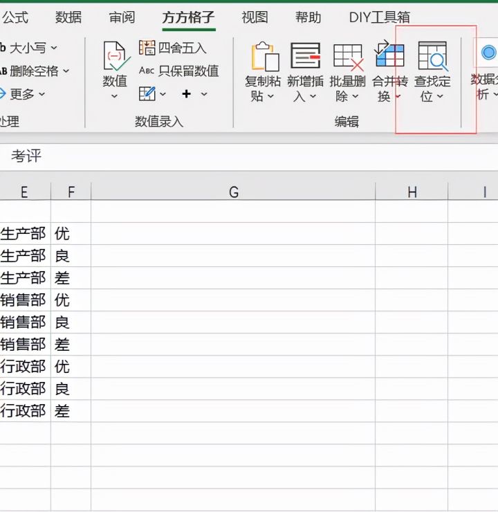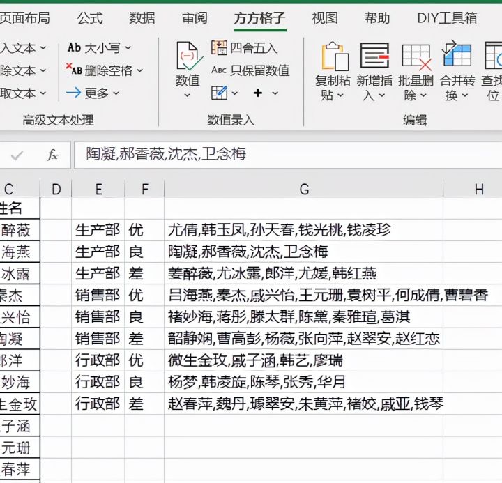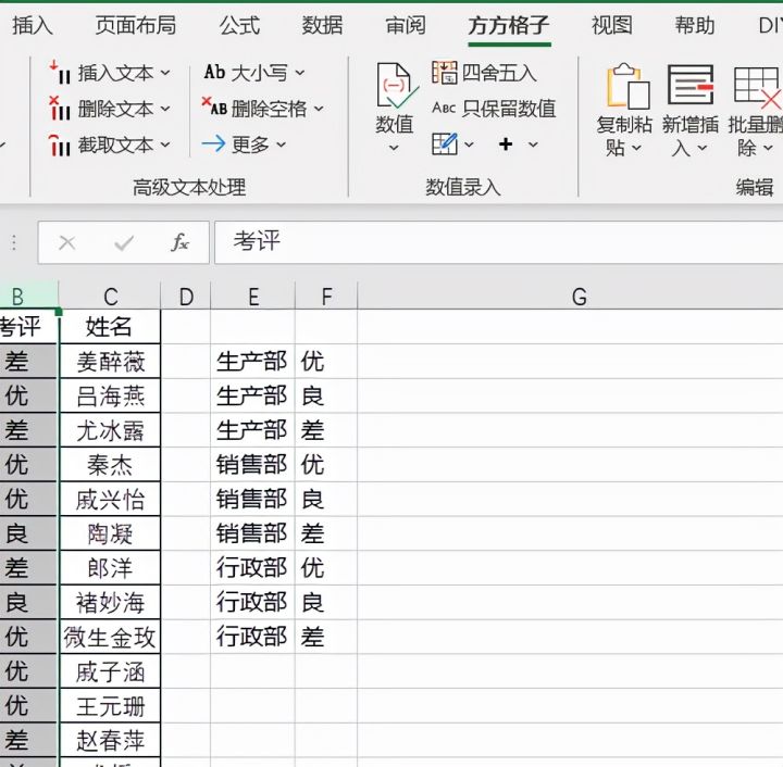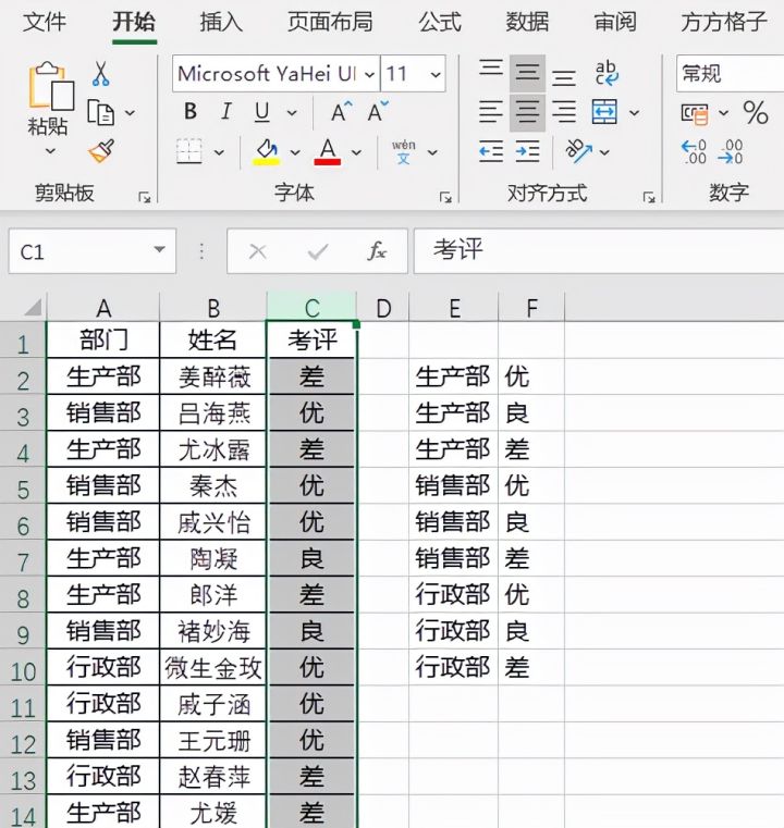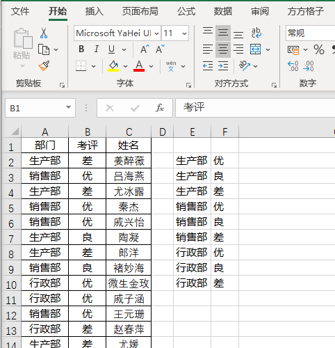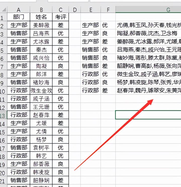 下图左侧是某公司年底业绩考评成绩表,现在想要将各部门各成绩的员工录入到同一单元格中如下图右侧。