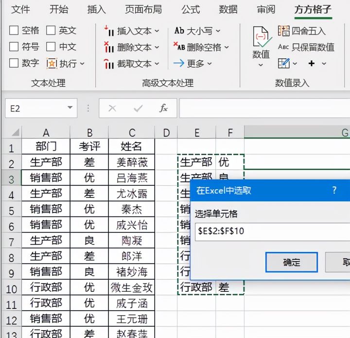 然后再弹出对话框中录入E2:F10,然后点击【确定】