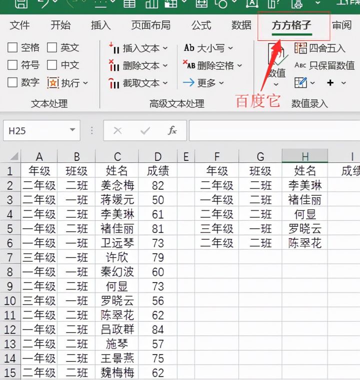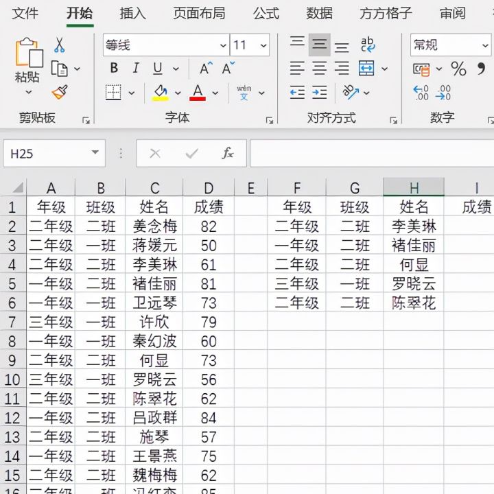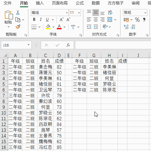 如下图,左侧是某学校某次竞赛成绩表,现在想要查找出右侧指定年级班级姓名的学生考试成绩。