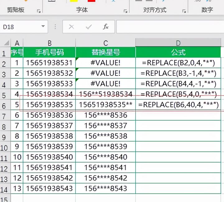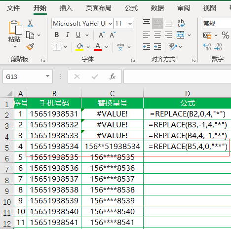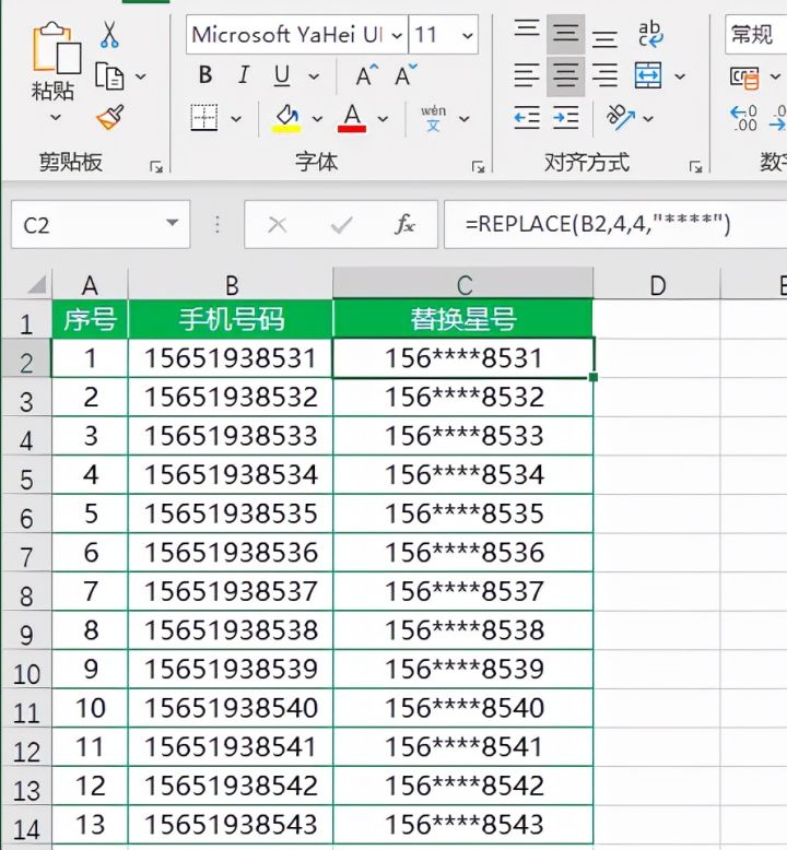 在C2单元格中输入公式=REPLACE(B2,4,4,"****")并下拉填充到底即可完成。