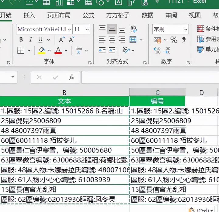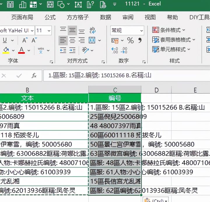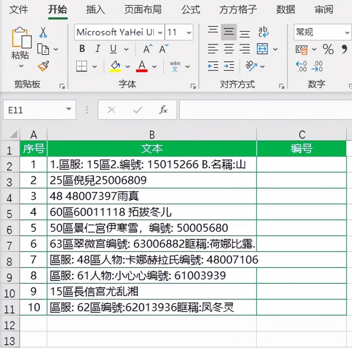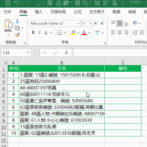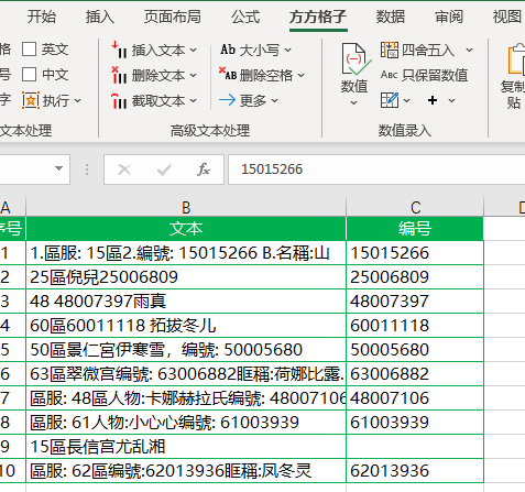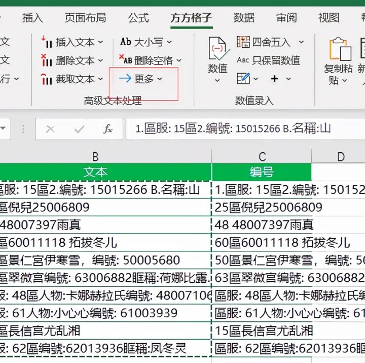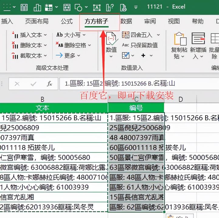 如下图B列是混合文本数据,现在想要从B列中快速提取出8位的数字区编号。
