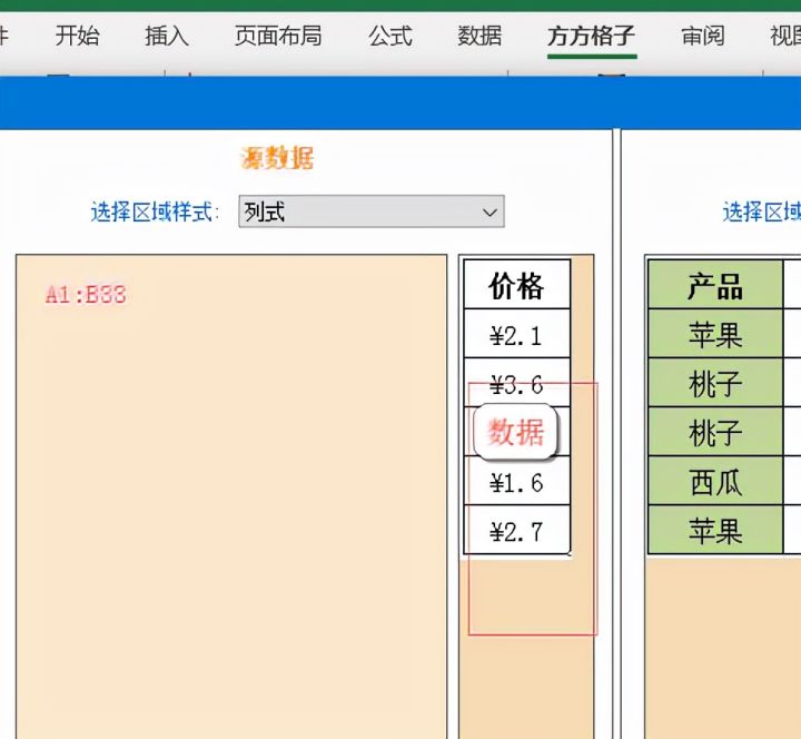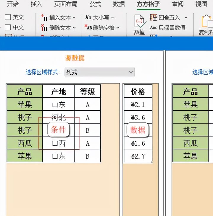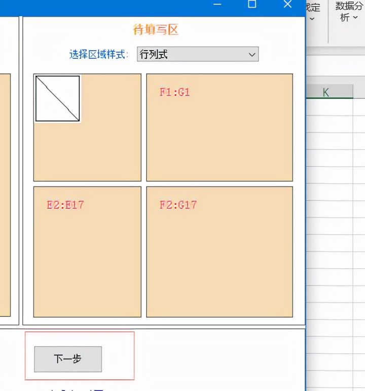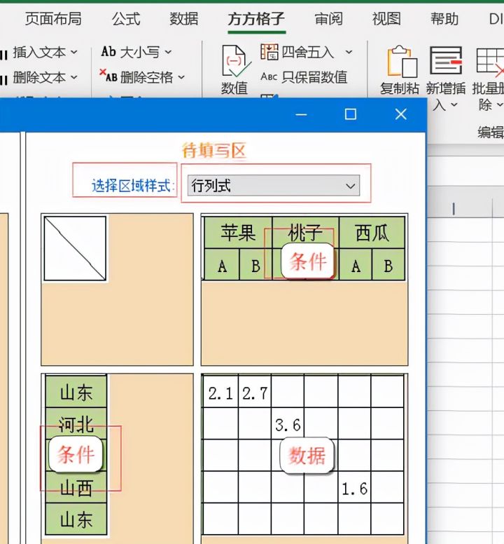 将待填写区中的【选择区域样式】设置为行列式,然后依旧按照上一步点击条件或数据,选择相对应的单元格区域。