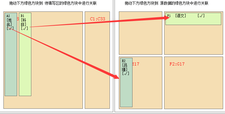 点击源数据中的姓名然后拖动到待填写区中的左下,将科目拖动到待填写区的右上区域,如下图所示。然后依次点击下一步,完成填表即可完成