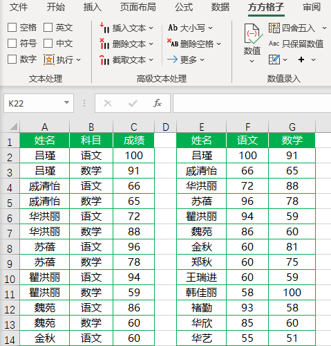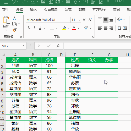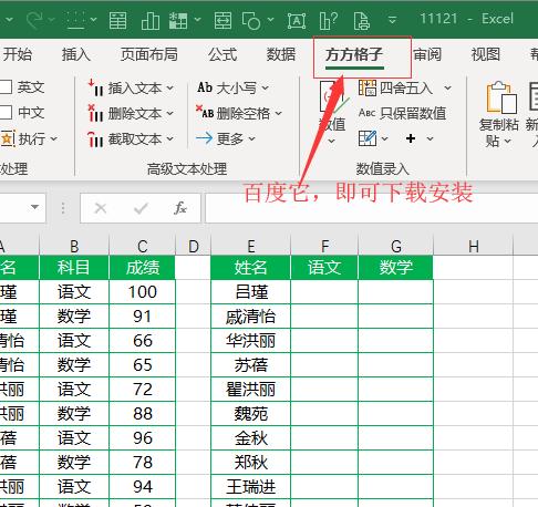 如下图A,B,C三列为一维学生成绩表,现在想要根据这三列数据快速填写F,G列单元格。