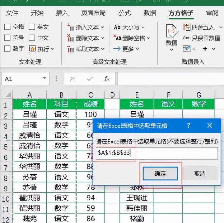 在弹出对话框中输入A1:B33,然后点击【确定】