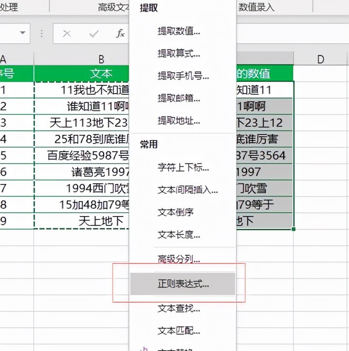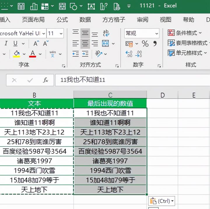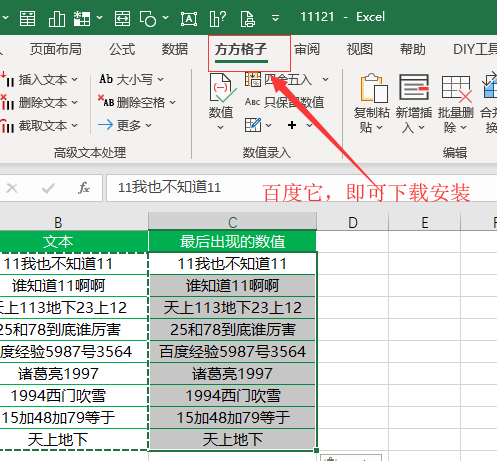 将B列单元格中的混合文本复制一份到C列中