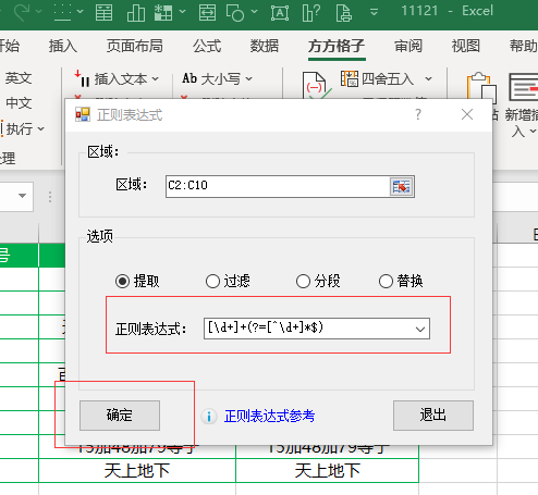 在【正则表达式;】后面的方框内输入“[\d+]+(?=[^\d+]*$)”,然后点击【确定】即可完成