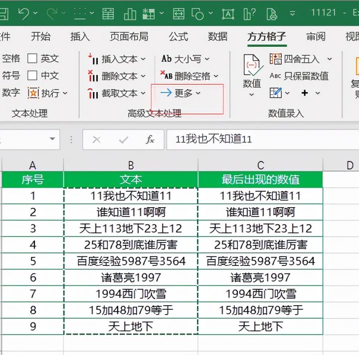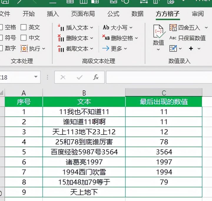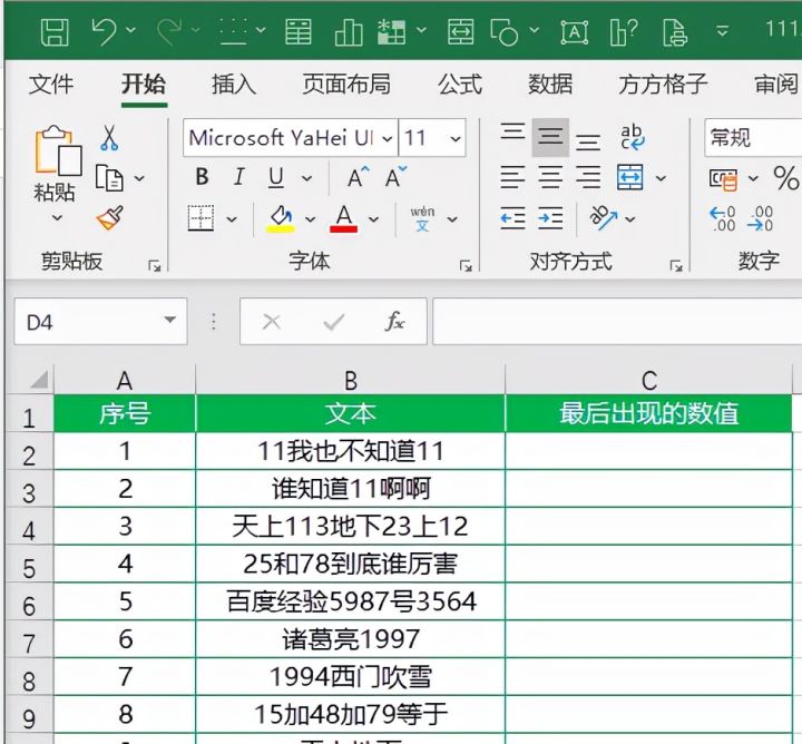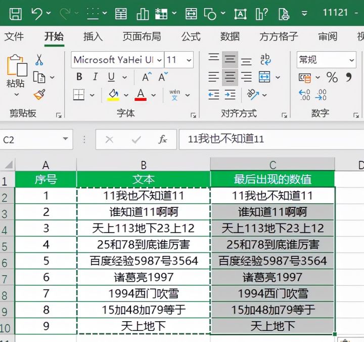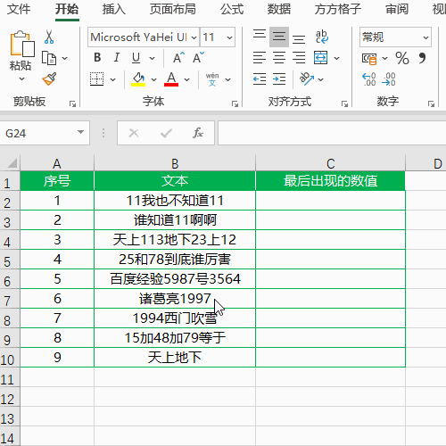 如下图B列单元格是一些混合文本,现在想要将B列单元格中最后一次出现的数值提取出来。