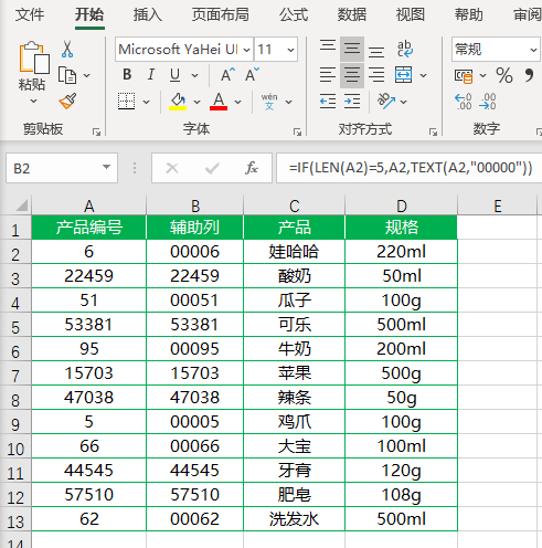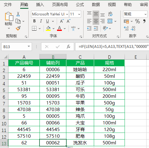 最后我们使用if函数进行条件判断,当产品编号为五位数字时,直接返回该编号,当编号不足五位数字时,调整格式用0补位。。