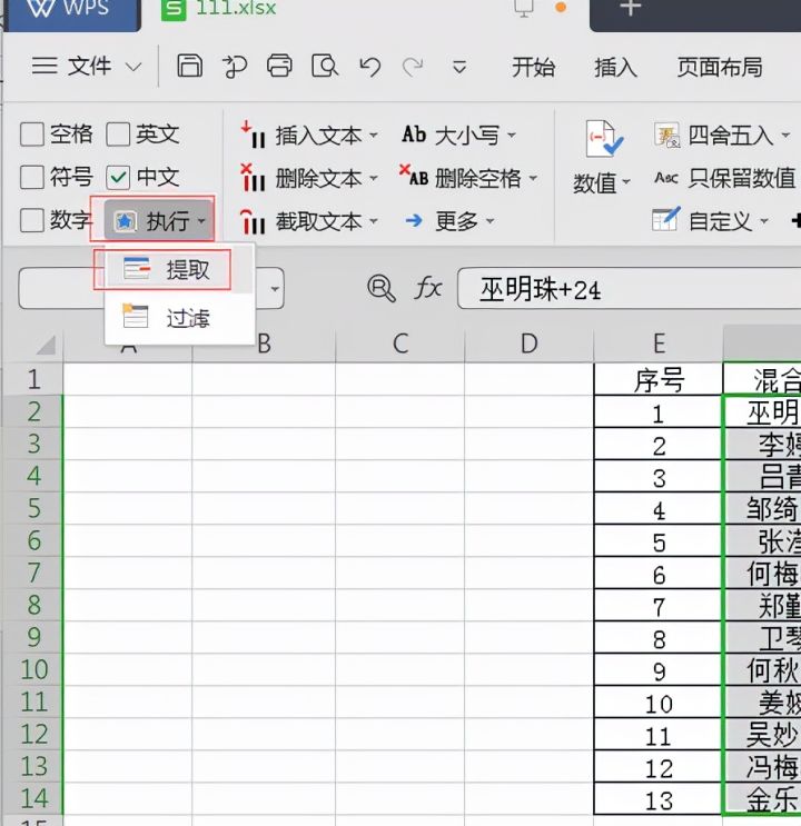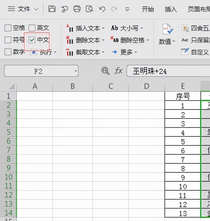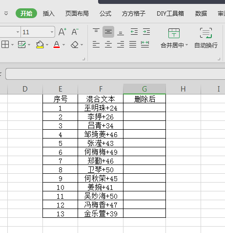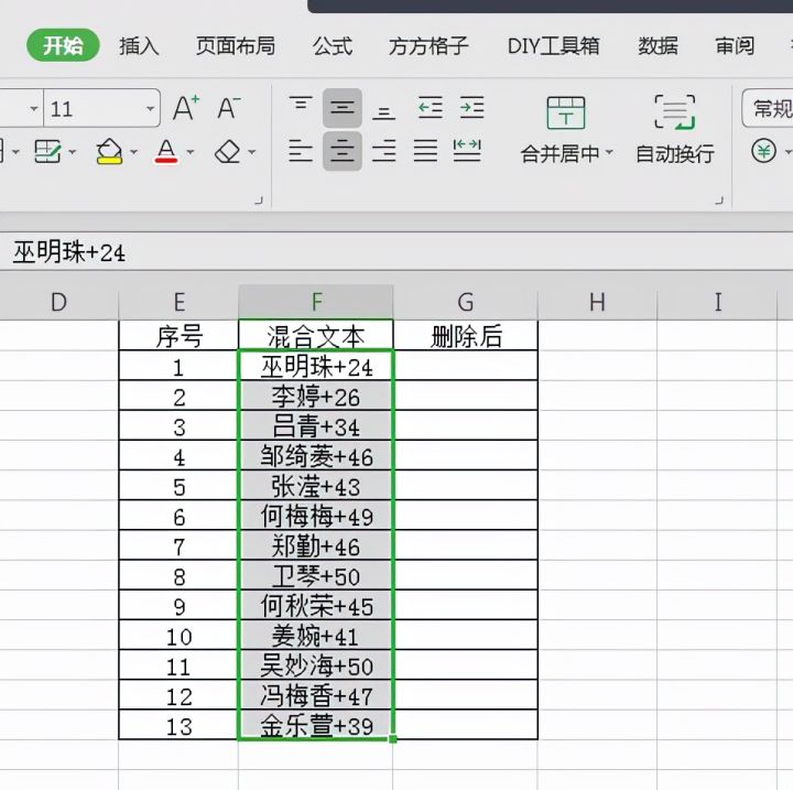 如下图F列单元格数据为姓名和符号数字,现在快速删除姓名后面的内容。