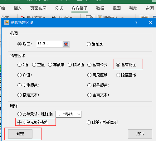 勾选【含有批注】,勾选【此单元格的整行】最后点击【确定】