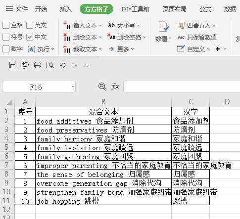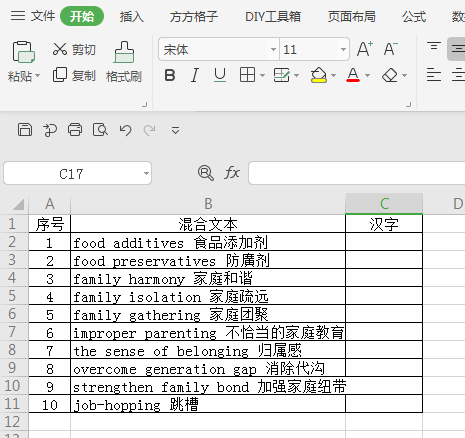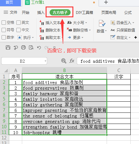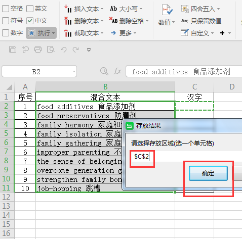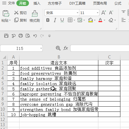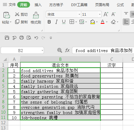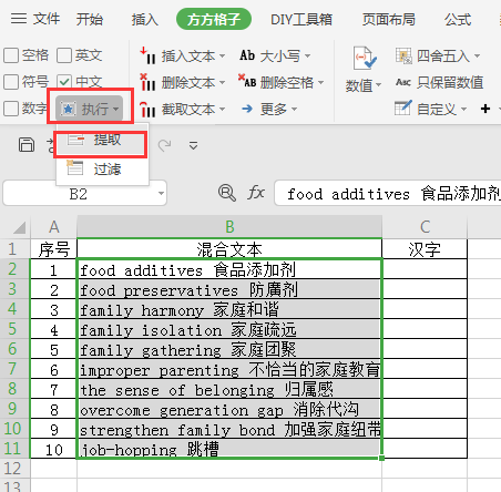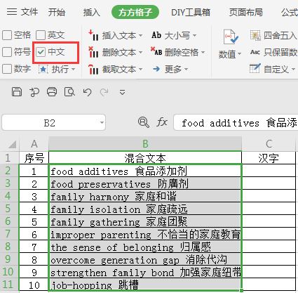 如下图,B列单元格为中英文混合文本,现在想要批量从B列单元格中提取出汉字。