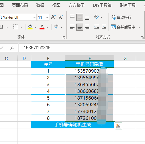 1.首先选中手机号码数据单元格区域(此处手机号码均为随机制作)