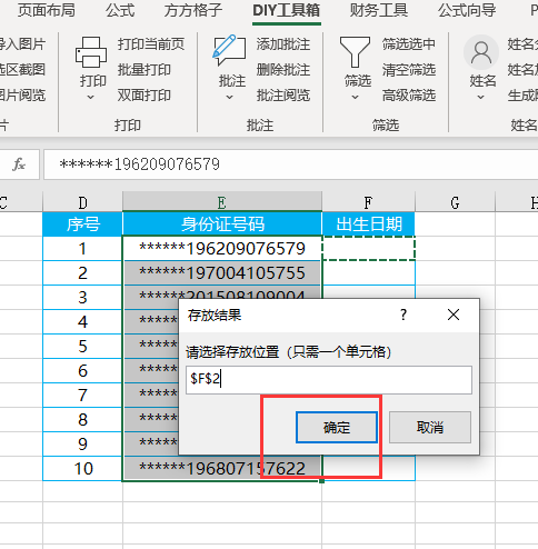 5.点击F2单元格作为存放位置,最后点击【确定】即可完成