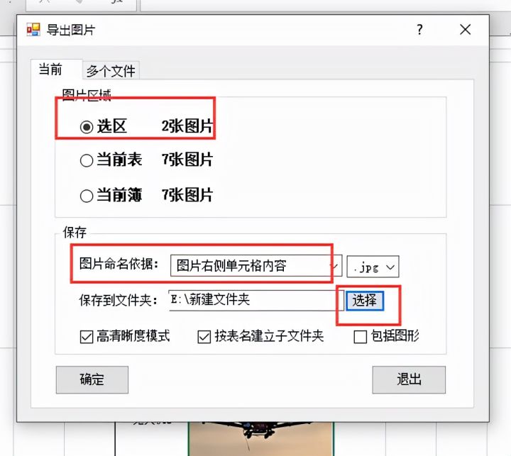 4.将【图片命名依据】设置为图片右侧单元格内容,然后点击【选择】设置图片保存位置