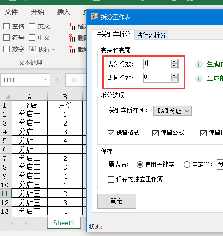 4.本文这里表头标题为1行,所以将【表头行数】设置为1