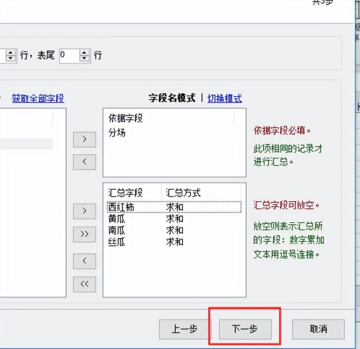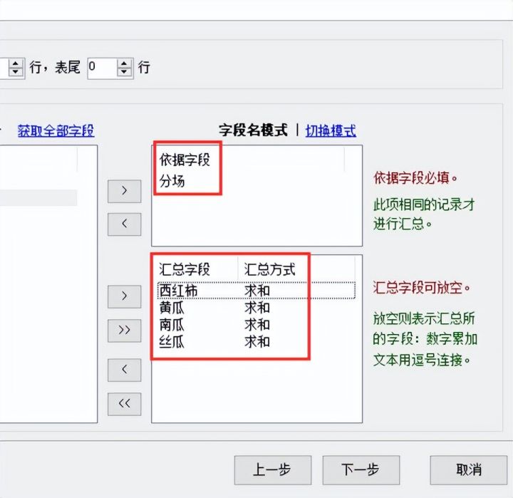 6.如下图,将分场添加到依据字段,然后将其余产品添加到汇总字段中