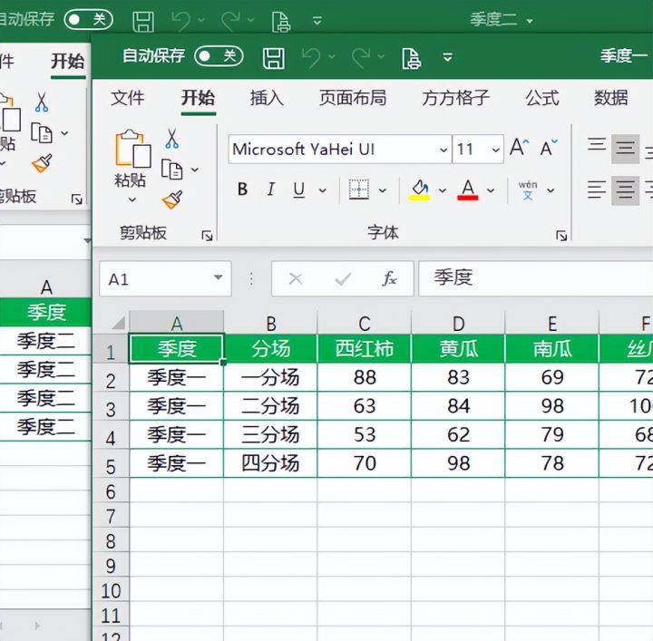 1.如下图是某农场两个季度各个产品的生产量,现在我们想要快速汇总这两个季度各产品汇总量。
